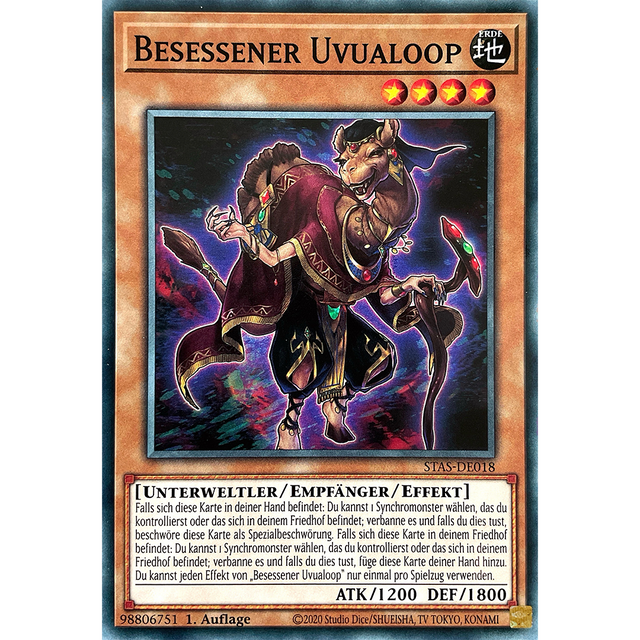 Falls sich diese Karte in deiner Hand befindet: Du kannst 1 Synchromonster wählen, das du kontrollierst oder das sich in deinem Friedhof befindet; verbanne es und falls du dies tust, beschwöre diese Karte als Spezialbeschwörung. Falls sich diese Karte in deinem Friedhof befindet: Du kannst 1 Synchromonster wählen, das du kontrollierst oder das sich in deinem Friedhof befindet; verbanne es und falls du dies tust, füge diese Karte deiner Hand hinzu. Du kannst jeden Effekt von „Besessener Uvualoop“ nur einmal pro Spielzug verwenden.