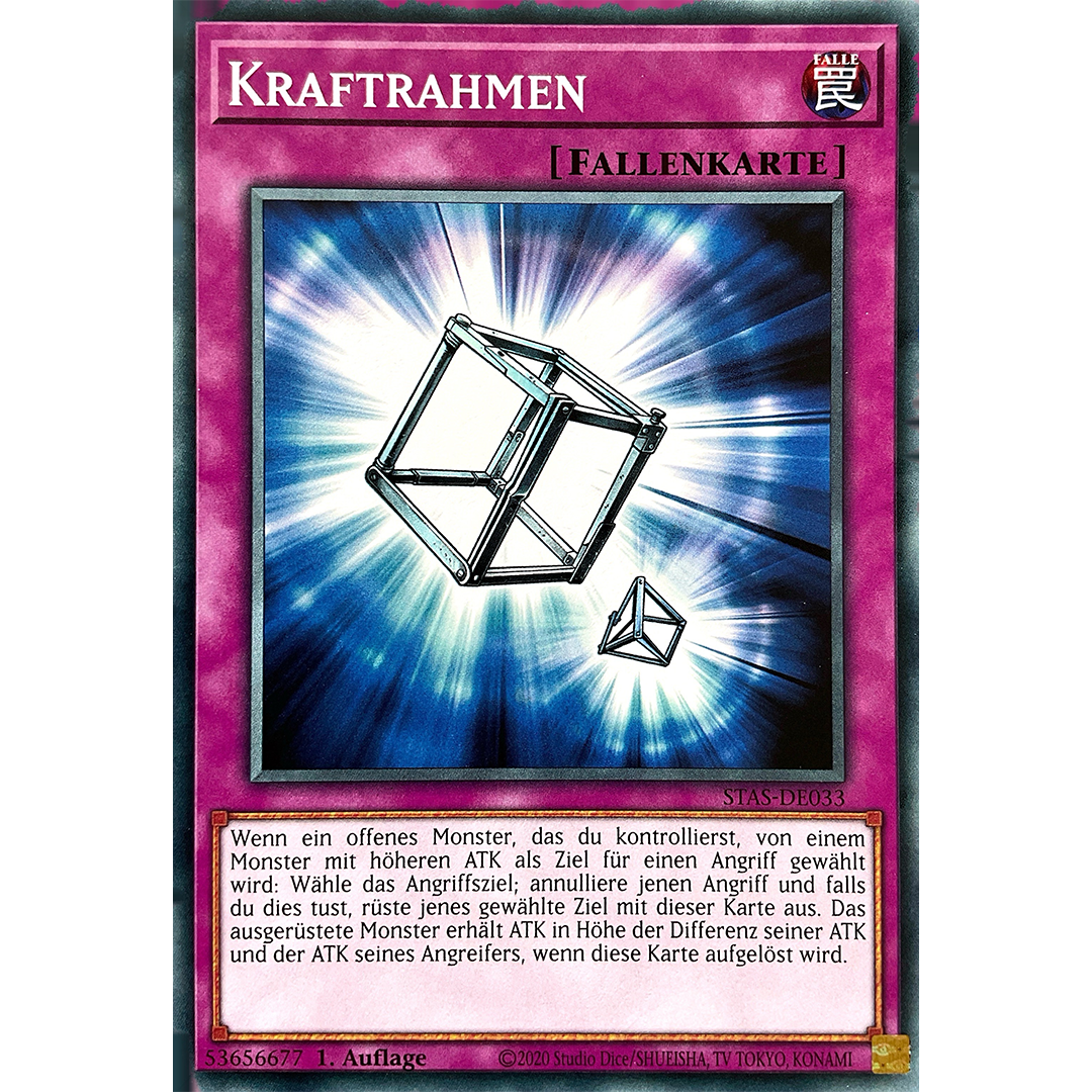 Wenn ein offenes Monster, das du kontrollierst, von einem Monster mit höheren ATK als Ziel für einen Angriff gewählt wird: Wähle das Angriffsziel; annulliere jenen Angriff und falls du dies tust, rüste jenes gewählte Ziel mit dieser Karte aus. Das ausgerüstete Monster erhält ATK in Höhe der Differenz seiner ATK und der ATK seines Angreifers, wenn diese Karte aufgelöst wird.
