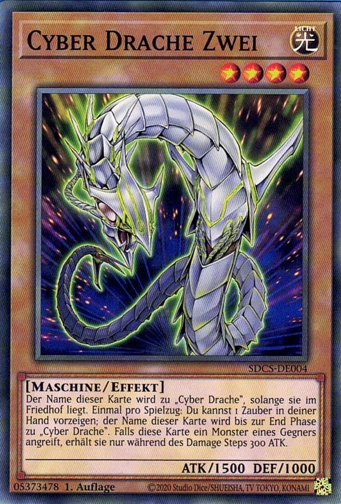 Der Name dieser Karte wird zu „Cyber Drache“, solange sie im Friedhof liegt. Einmal pro Spielzug: Du kannst 1 Zauber in deiner Hand vorzeigen; der Name dieser Karte wird bis zur End Phase zu „Cyber Drache“. Falls diese Karte ein Monster eines Gegners angreift, erhält sie nur während des Damage Steps 300 ATK.