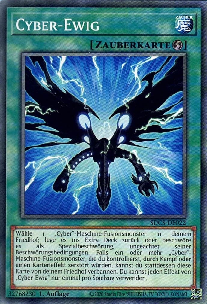 Wähle 1 „Cyber“-Maschine-Fusionsmonster in deinem Friedhof; lege es ins Extra Deck zurück oder beschwöre es als Spezialbeschwörung, ungeachtet seiner Beschwörungsbedingungen. Falls ein oder mehr „Cyber“-Maschine-Fusionsmonster, die du kontrollierst, durch Kampf oder einen Karteneffekt zerstört würden, kannst du stattdessen diese Karte von deinem Friedhof verbannen. Du kannst jeden Effekt von „Cyber-Ewig“ nur einmal pro Spielzug verwenden.