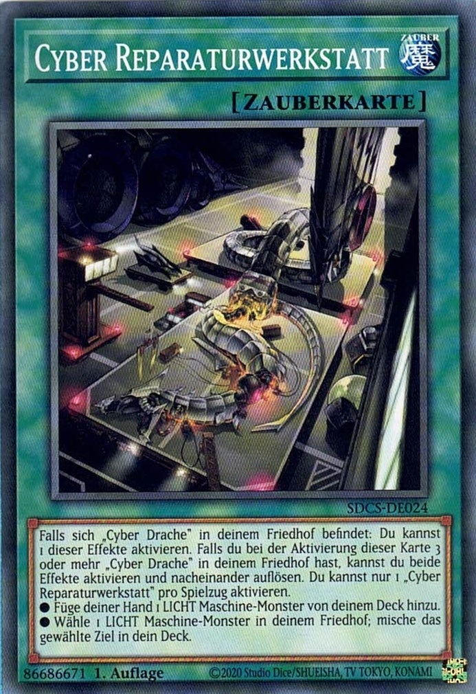 Falls sich „Cyber Drache“ in deinem Friedhof befindet: Du kannst 1 dieser Effekte aktivieren. Falls du bei der Aktivierung dieser Karte 3 oder mehr „Cyber Drache“ in deinem Friedhof hast, kannst du beide Effekte aktivieren und nacheinander auflösen. Du kannst nur 1 „Cyber Reparaturwerkstatt“ pro Spielzug aktivieren.