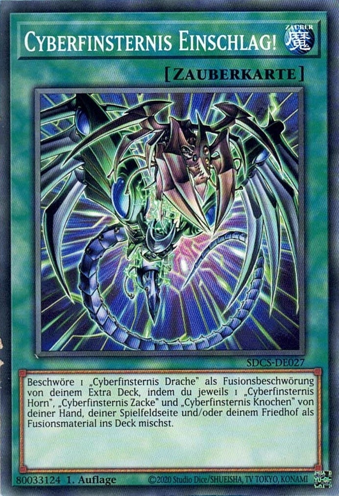 Beschwöre 1 „Cyberfinsternis Drache“ als Fusionsbeschwörung von deinem Extra Deck, indem du jeweils 1 „Cyberfinsternis Horn“, „Cyberfinsternis Zacke“ und „Cyberfinsternis Knochen“ von deiner Hand, deiner Spielfeldseite und/oder deinem Friedhof als Fusionsmaterial ins Deck mischst.