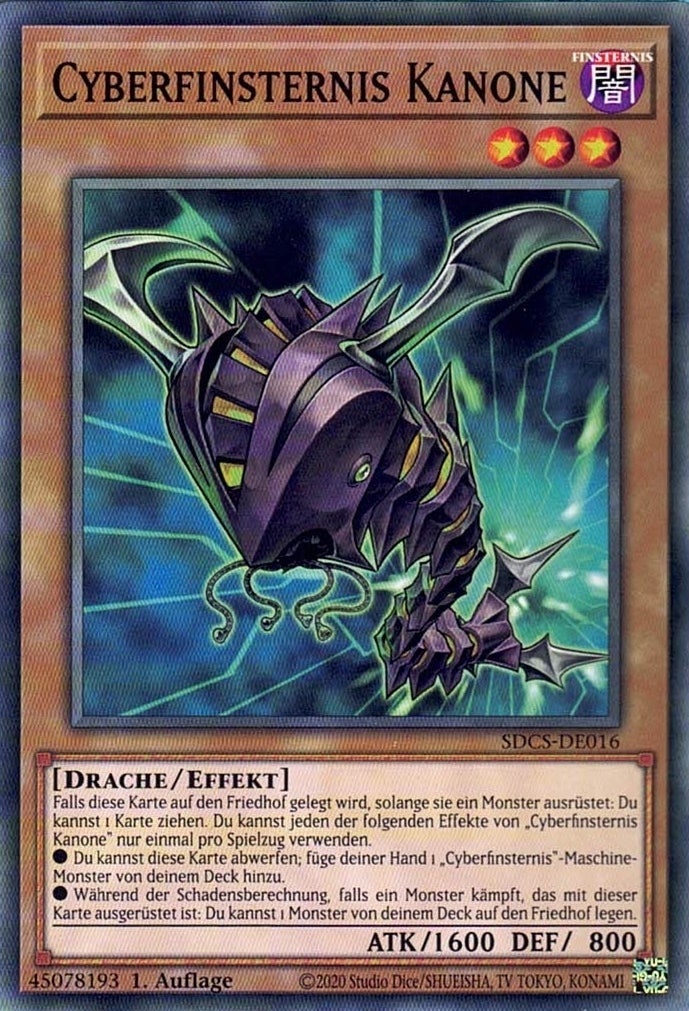 Falls diese Karte auf den Friedhof gelegt wird, solange sie ein Monster ausrüstet: Du kannst 1 Karte ziehen. Du kannst jeden der folgenden Effekte von „Cyberfinsternis Kanone“ nur einmal pro Spielzug verwenden.