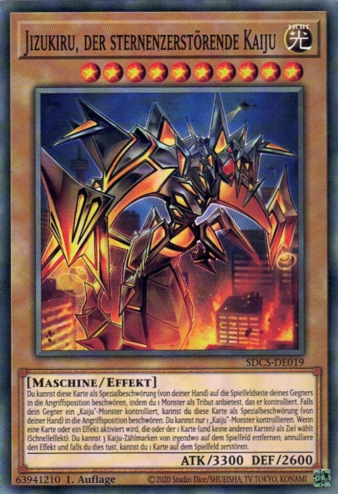 Du kannst diese Karte als Spezialbeschwörung (von deiner Hand) auf die Spielfeldseite deines Gegners in die Angriffsposition beschwören, indem du 1 Monster als Tribut anbietest, das er kontrolliert. Falls dein Gegner ein „Kaiju“-Monster kontrolliert, kannst du diese Karte als Spezialbeschwörung (von deiner Hand) in die Angriffsposition beschwören. Du kannst nur 1 „Kaiju“-Monster kontrollieren. Wenn eine Karte oder ein Effekt aktiviert wird, die oder der 1 Karte (und keine anderen Karten) als Ziel wählt (Schnelleffekt): Du kannst 3 Kaiju-Zählmarken von irgendwo auf dem Spielfeld entfernen; annulliere den Effekt und falls du dies tust, kannst du 1 Karte auf dem Spielfeld zerstören.