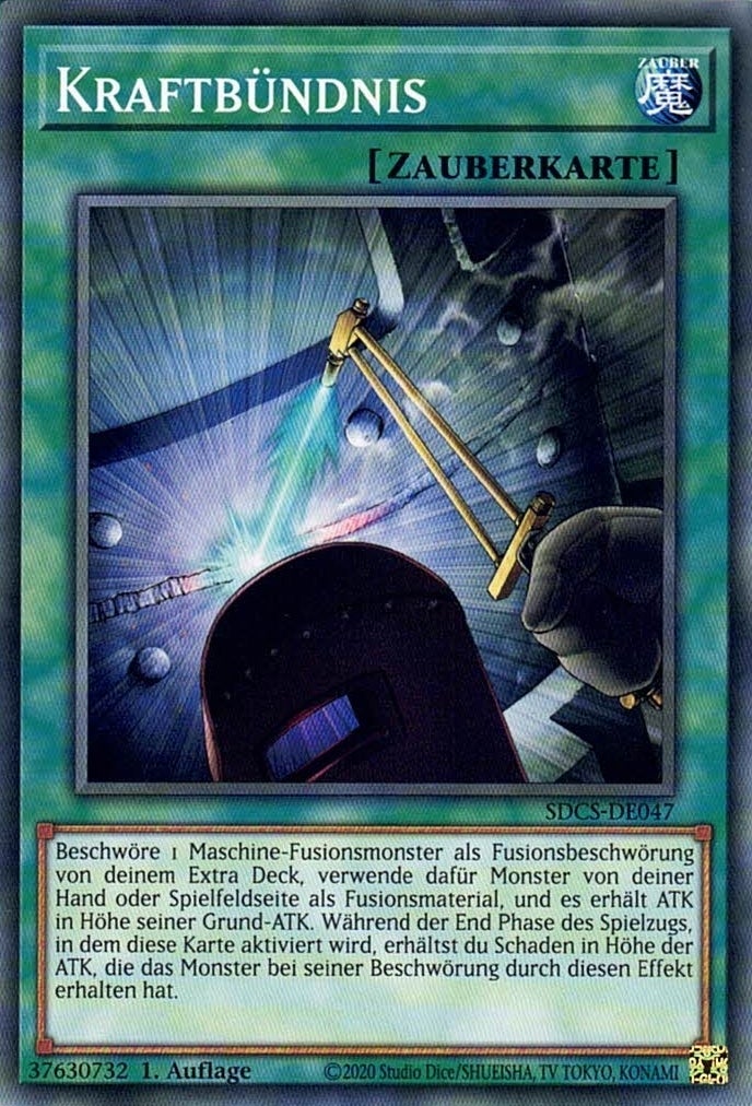 Beschwöre 1 Maschine-Fusionsmonster als Fusionsbeschwörung von deinem Extra Deck, verwende dafür Monster von deiner Hand oder Spielfeldseite als Fusionsmaterial, und es erhält ATK in Höhe seiner Grund-ATK. Während der End Phase des Spielzugs, in dem diese Karte aktiviert wird, erhältst du Schaden in Höhe der ATK, die das Monster bei seiner Beschwörung durch diesen Effekt erhalten hat.