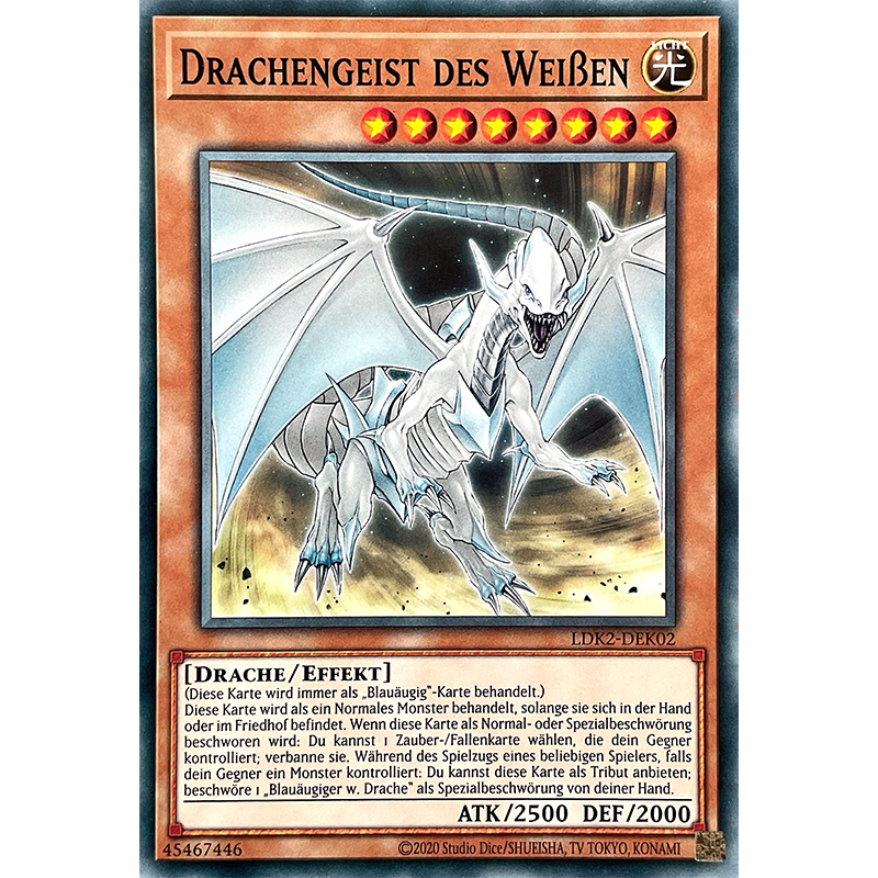 Diese Karte wird als Normales Monster behandelt, solange sie sich in der Hand oder im Friedhof befindet. Wenn diese Karte als Normal- oder Spezialbeschwörung beschworen wird: Du kannst 1 Zauber/Falle wählen, den oder die dein Gegner kontrolliert; verbanne ihn oder sie. Falls dein Gegner ein Monster kontrolliert (Schnelleffekt): Du kannst diese Karte als Tribut anbieten; beschwöre 1 „Blauäugiger w. Drache“ als Spezialbeschwörung von deiner Hand.