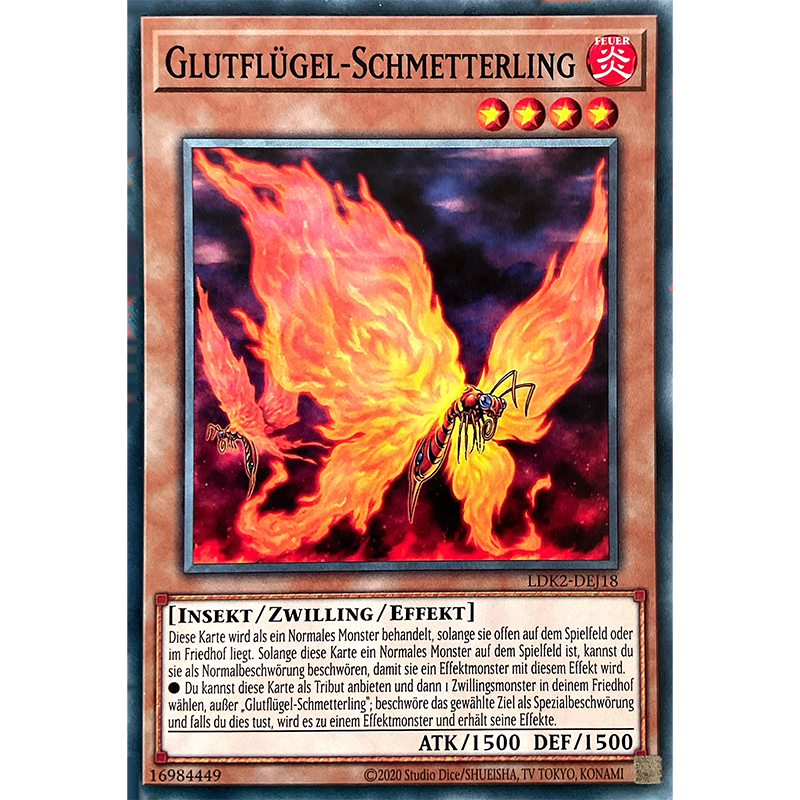 ●Du kannst diese Karte als Tribut anbieten und dann 1 Zwillingsmonster in deinem Friedhof wählen, außer „Glutflügel-Schmetterling“; beschwöre das gewählte Ziel als Spezialbeschwörung und falls du dies tust, wird es zu einem Effektmonster und erhält seine Effekte.