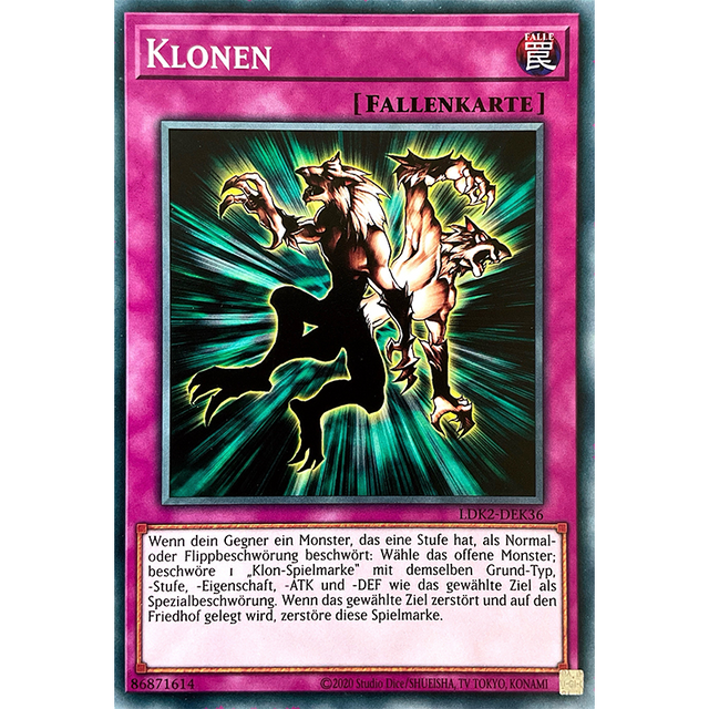 Wenn dein Gegner ein Monster, das eine Stufe hat, als Normal- oder Flippbeschwörung beschwört: Wähle das offene Monster; beschwöre 1 „Klon-Spielmarke“ mit demselben Grund-Typ, -Stufe, -Eigenschaft, -ATK und -DEF wie das gewählte Ziel als Spezialbeschwörung. Wenn das gewählte Ziel zerstört und auf den Friedhof gelegt wird, zerstöre diese Spielmarke.