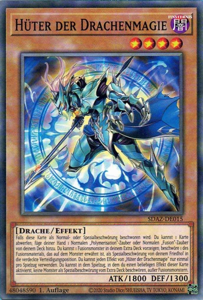 Falls diese Karte als Normal- oder Spezialbeschwörung beschworen wird: Du kannst 1 Karte abwerfen; füge deiner Hand 1 Normalen „Polymerisation“-Zauber oder Normalen „Fusion“-Zauber von deinem Deck hinzu. Du kannst 1 Fusionsmonster in deinem Extra Deck vorzeigen; beschwöre 1 des Fusionsmaterials, dessen Name ausdrücklich auf dem Monster aufgeführt ist, als Spezialbeschwörung von deinem Friedhof in die verdeckte Verteidigungsposition. Du kannst jeden Effekt von „Hüter der Drachenmagie“ nur einmal pro Spielzug verwenden. Du kannst in dem Spielzug, in dem du einen beliebigen Effekt dieser Karte aktivierst, keine Monster als Spezialbeschwörung vom Extra Deck beschwören, außer Fusionsmonstern.