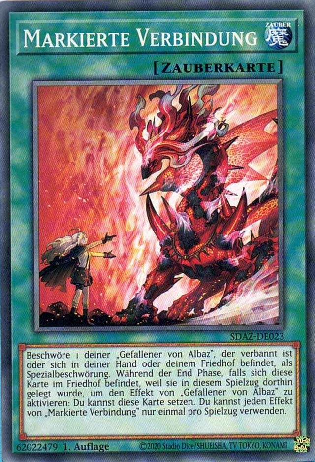 Beschwöre 1 deiner „Gefallener von Albaz“, der verbannt ist oder sich in deiner Hand oder deinem Friedhof befindet, als Spezialbeschwörung. Während der End Phase, falls sich diese Karte im Friedhof befindet, weil sie in diesem Spielzug dorthin gelegt wurde, um den Effekt von „Gefallener von Albaz“ zu aktivieren: Du kannst diese Karte setzen. Du kannst jeden Effekt von „Markierte Verbindung“ nur einmal pro Spielzug verwenden.