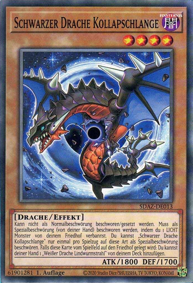 Kann nicht als Normalbeschwörung beschworen/gesetzt werden. Muss als Spezialbeschwörung (von deiner Hand) beschworen werden, indem du 1 LICHT Monster von deinem Friedhof verbannst. Du kannst „Schwarzer Drache Kollapschlange“ nur einmal pro Spielzug auf diese Art als Spezialbeschwörung beschwören. Falls diese Karte vom Spielfeld auf den Friedhof gelegt wird: Du kannst deiner Hand 1 „Weißer Drache Lindwurmstrahl“ von deinem Deck hinzufügen.