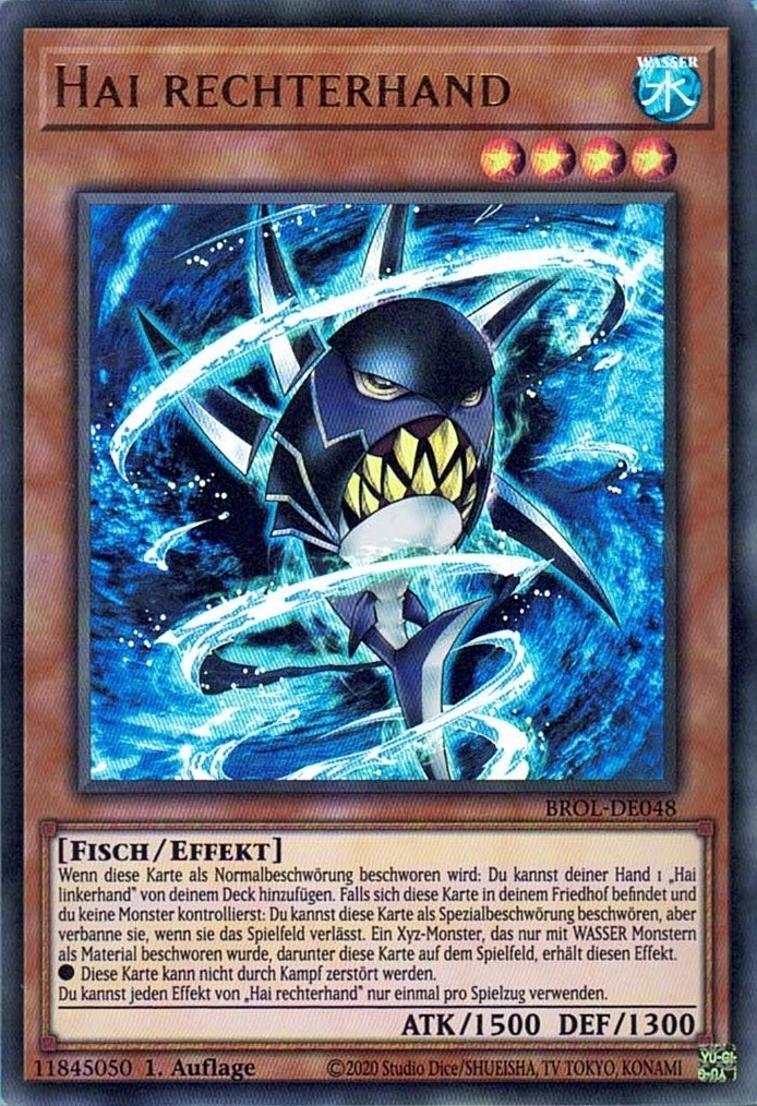 Wenn diese Karte als Normalbeschwörung beschworen wird: Du kannst deiner Hand 1 „Hai linkerhand“ von deinem Deck hinzufügen. Falls sich diese Karte in deinem Friedhof befindet und du keine Monster kontrollierst: Du kannst diese Karte als Spezialbeschwörung beschwören, aber verbanne sie, wenn sie das Spielfeld verlässt. Ein Xyz-Monster, das nur mit WASSER Monstern als Material beschworen wurde, darunter diese Karte auf dem Spielfeld, erhält diesen Effekt.