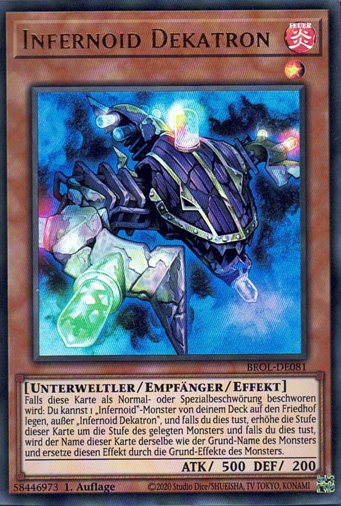 Falls diese Karte als Normal- oder Spezialbeschwörung beschworen wird: Du kannst 1 „Infernoid“-Monster von deinem Deck auf den Friedhof legen, außer „Infernoid Dekatron“, und falls du dies tust, erhöhe die Stufe dieser Karte um die Stufe des gelegten Monsters und falls du dies tust, wird der Name dieser Karte derselbe wie der Grund-Name des Monsters und ersetze diesen Effekt durch die Grund-Effekte des Monsters.