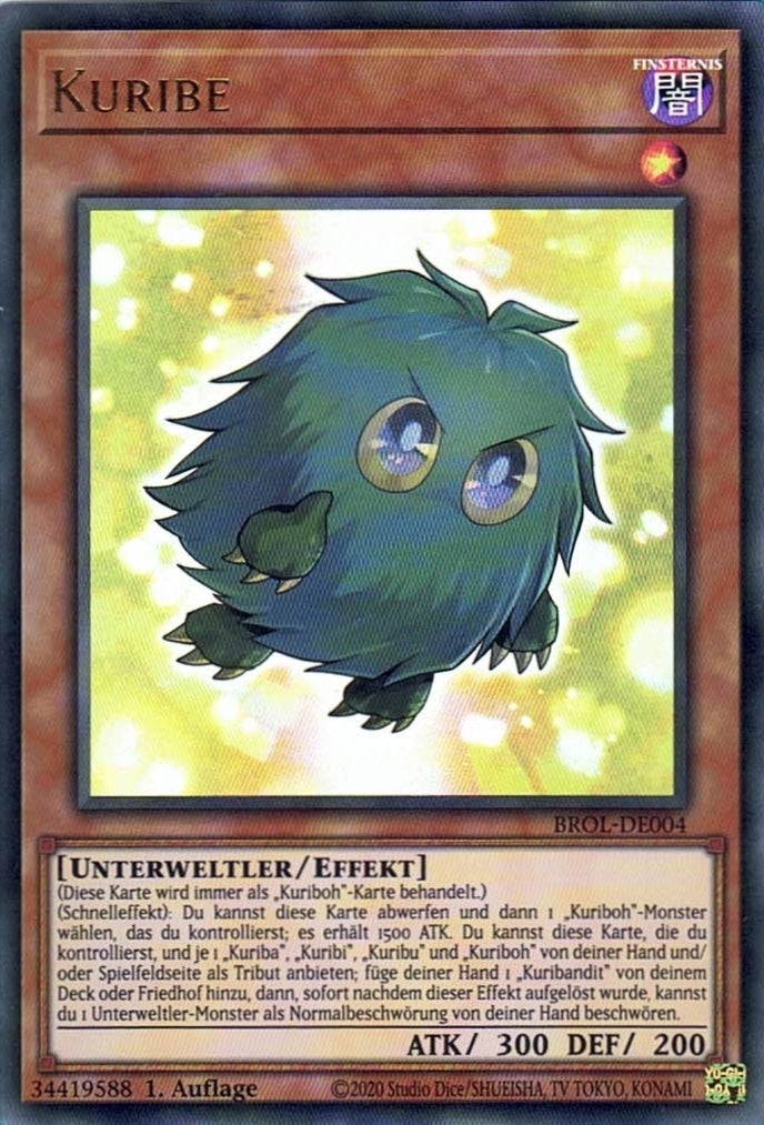 (Schnelleffekt): Du kannst diese Karte abwerfen und dann 1 „Kuriboh“-Monster wählen, das du kontrollierst; es erhält 1500 ATK. Du kannst diese Karte, die du kontrollierst, und je 1 „Kuriba“, „Kuribi“, „Kuribu“ und „Kuriboh“ von deiner Hand und/oder Spielfeldseite als Tribut anbieten; füge deiner Hand 1 „Kuribandit“ von deinem Deck oder Friedhof hinzu, dann, sofort nachdem dieser Effekt aufgelöst wurde, kannst du 1 Unterweltler-Monster als Normalbeschwörung von deiner Hand beschwören.