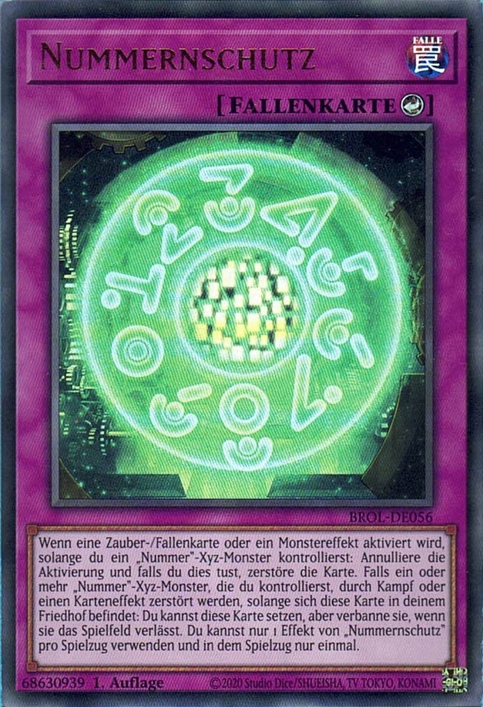 Wenn eine Zauber-/Fallenkarte oder ein Monstereffekt aktiviert wird, solange du ein „Nummer“-Xyz-Monster kontrollierst: Annulliere die Aktivierung und falls du dies tust, zerstöre die Karte. Falls ein oder mehr „Nummer“-Xyz-Monster, die du kontrollierst, durch Kampf oder einen Karteneffekt zerstört werden, solange sich diese Karte in deinem Friedhof befindet: Du kannst diese Karte setzen, aber verbanne sie, wenn sie das Spielfeld verlässt. Du kannst nur 1 Effekt von „Nummernschutz“ pro Spielzug verwenden und in dem Spielzug nur einmal.