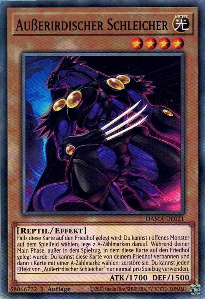 Falls diese Karte auf den Friedhof gelegt wird: Du kannst 1 offenes Monster auf dem Spielfeld wählen; lege 2 A-Zählmarken darauf. Während deiner Main Phase, außer in dem Spielzug, in dem diese Karte auf den Friedhof gelegt wurde: Du kannst diese Karte von deinem Friedhof verbannen und dann 1 Karte mit einer A-Zählmarke wählen; zerstöre sie. Du kannst jeden Effekt von „Außerirdischer Schleicher“ nur einmal pro Spielzug verwenden.