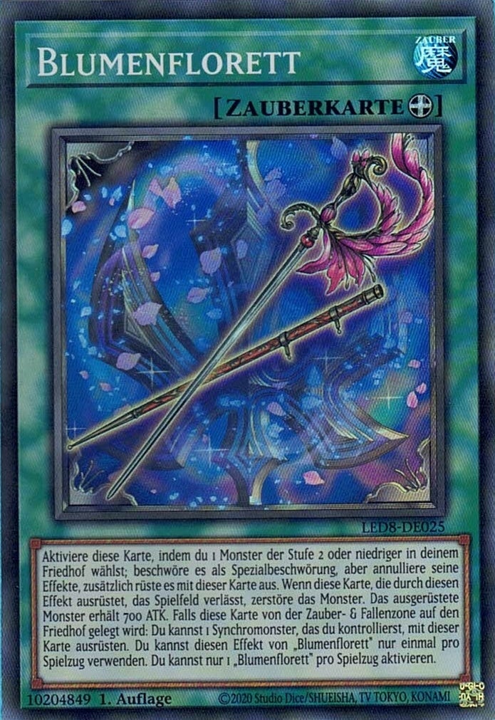 Aktiviere diese Karte, indem du 1 Monster der Stufe 2 oder niedriger in deinem Friedhof wählst; beschwöre es als Spezialbeschwörung, aber annulliere seine Effekte, zusätzlich rüste es mit dieser Karte aus. Wenn diese Karte, die durch diesen Effekt ausrüstet, das Spielfeld verlässt, zerstöre das Monster. Das ausgerüstete Monster erhält 700 ATK. Falls diese Karte von der Zauber- & Fallenzone auf den Friedhof gelegt wird: Du kannst 1 Synchromonster, das du kontrollierst, mit dieser Karte ausrüsten. Du kannst diesen Effekt von „Blumenflorett“ nur einmal pro Spielzug verwenden. Du kannst nur 1 „Blumenflorett“ pro Spielzug aktivieren.