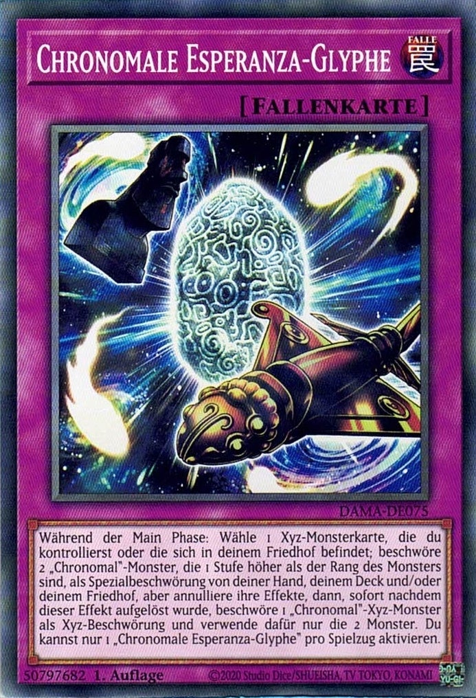 Während der Main Phase: Wähle 1 Xyz-Monsterkarte, die du kontrollierst oder die sich in deinem Friedhof befindet; beschwöre 2 „Chronomal“-Monster, die 1 Stufe höher als der Rang des Monsters sind, als Spezialbeschwörung von deiner Hand, deinem Deck und/oder deinem Friedhof, aber annulliere ihre Effekte, dann, sofort nachdem dieser Effekt aufgelöst wurde, beschwöre 1 „Chronomal“-Xyz-Monster als Xyz-Beschwörung und verwende dafür nur die 2 Monster. Du kannst nur 1 „Chronomale Esperanza-Glyphe“ pro Spielzug aktivieren.
