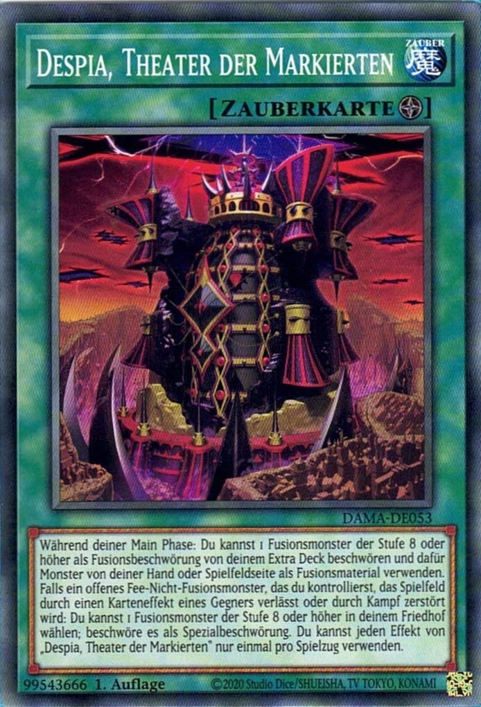 Während deiner Main Phase: Du kannst 1 Fusionsmonster der Stufe 8 oder höher als Fusionsbeschwörung von deinem Extra Deck beschwören und dafür Monster von deiner Hand oder Spielfeldseite als Fusionsmaterial verwenden. Falls ein offenes Fee-Nicht-Fusionsmonster, das du kontrollierst, das Spielfeld durch einen Karteneffekt eines Gegners verlässt oder durch Kampf zerstört wird: Du kannst 1 Fusionsmonster der Stufe 8 oder höher in deinem Friedhof wählen; beschwöre es als Spezialbeschwörung. Du kannst jeden Effekt von „Despia, Theater der Markierten“ nur einmal pro Spielzug verwenden.