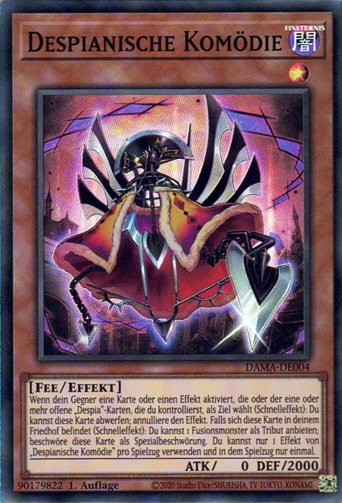 Wenn dein Gegner eine Karte oder einen Effekt aktiviert, die oder der eine oder mehr offene „Despia“-Karten, die du kontrollierst, als Ziel wählt (Schnelleffekt): Du kannst diese Karte abwerfen; annulliere den Effekt. Falls sich diese Karte in deinem Friedhof befindet (Schnelleffekt): Du kannst 1 Fusionsmonster als Tribut anbieten; beschwöre diese Karte als Spezialbeschwörung. Du kannst nur 1 Effekt von „Despianische Komödie“ pro Spielzug verwenden und in dem Spielzug nur einmal.
