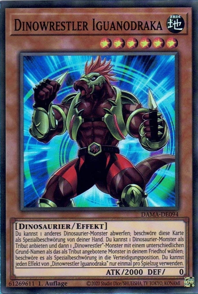 Du kannst 1 anderes Dinosaurier-Monster abwerfen; beschwöre diese Karte als Spezialbeschwörung von deiner Hand. Du kannst 1 Dinosaurier-Monster als Tribut anbieten und dann 1 „Dinowrestler“-Monster mit einem unterschiedlichen Grund-Namen als das als Tribut angebotene Monster in deinem Friedhof wählen; beschwöre es als Spezialbeschwörung in die Verteidigungsposition. Du kannst jeden Effekt von „Dinowrestler Iguanodraka“ nur einmal pro Spielzug verwenden.