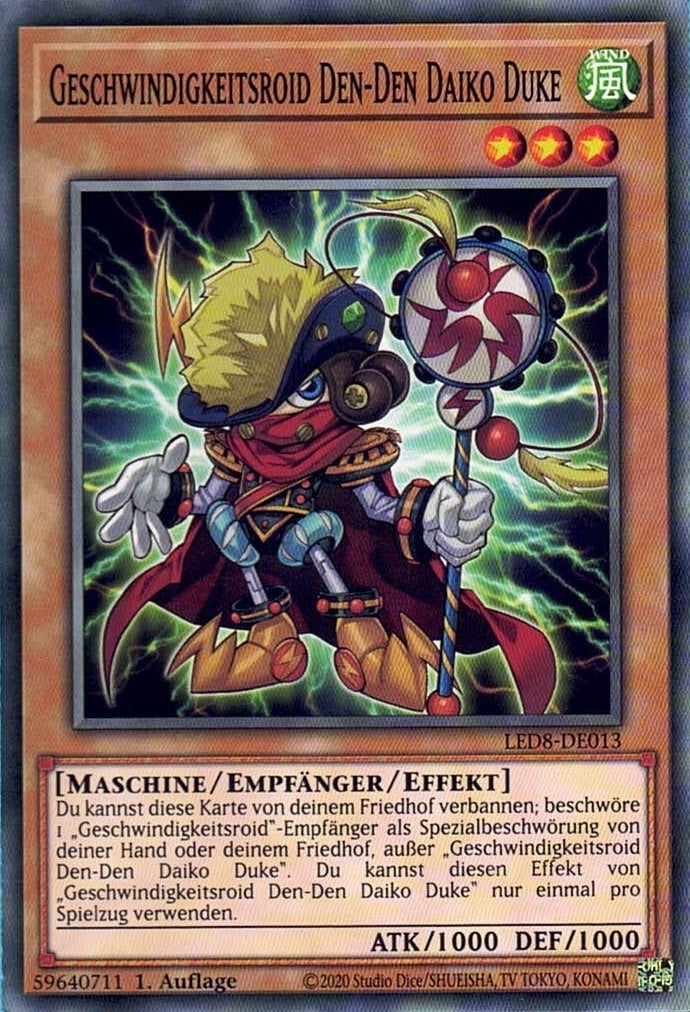 Du kannst diese Karte von deinem Friedhof verbannen; beschwöre 1 „Geschwindigkeitsroid“-Empfänger als Spezialbeschwörung von deiner Hand oder deinem Friedhof, außer „Geschwindigkeitsroid Den-Den Daiko Duke“. Du kannst diesen Effekt von „Geschwindigkeitsroid Den-Den Daiko Duke“ nur einmal pro Spielzug verwenden.