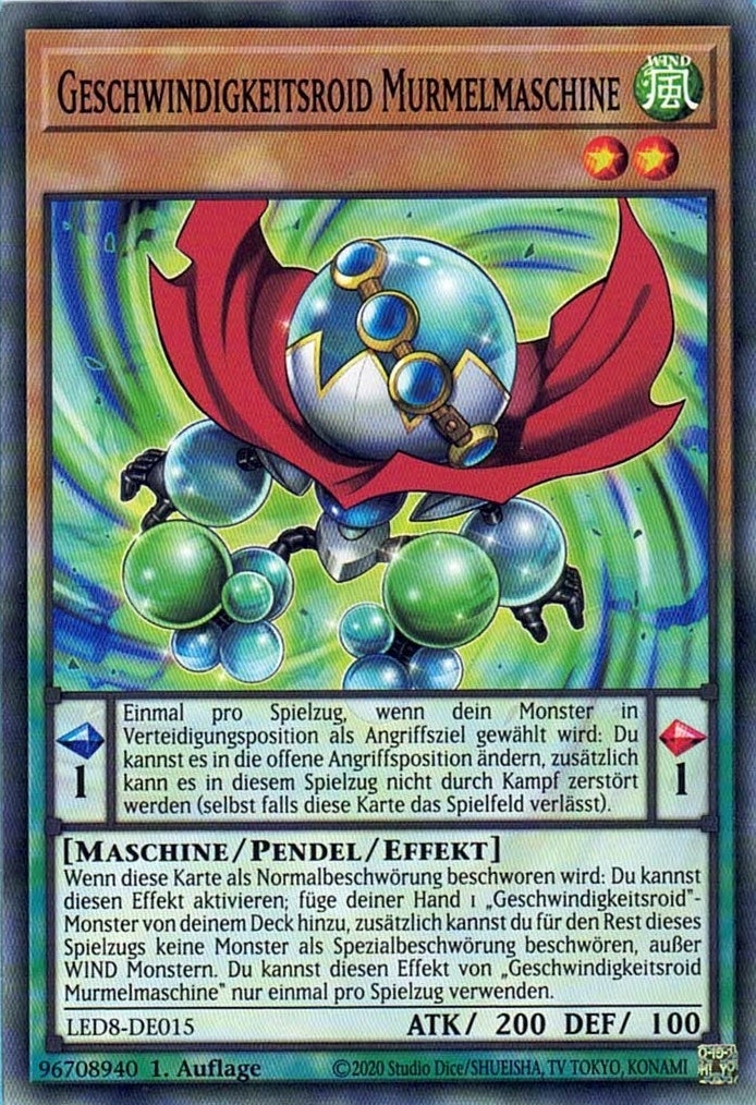 Wenn diese Karte als Normalbeschwörung beschworen wird: Du kannst diesen Effekt aktivieren; füge deiner Hand 1 „Geschwindigkeitsroid“-Monster von deinem Deck hinzu, zusätzlich kannst du für den Rest dieses Spielzugs keine Monster als Spezialbeschwörung beschwören, außer WIND Monstern. Du kannst diesen Effekt von „Geschwindigkeitsroid Murmelmaschine“ nur einmal pro Spielzug verwenden.
