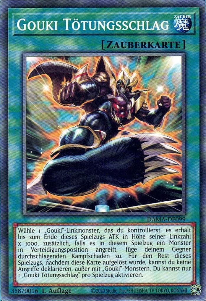 Wähle 1 „Gouki“-Linkmonster, das du kontrollierst; es erhält bis zum Ende dieses Spielzugs ATK in Höhe seiner Linkzahl x 1000, zusätzlich, falls es in diesem Spielzug ein Monster in Verteidigungsposition angreift, füge deinem Gegner durchschlagenden Kampfschaden zu. Für den Rest dieses Spielzugs, nachdem diese Karte aufgelöst wurde, kannst du keine Angriffe deklarieren, außer mit „Gouki“-Monstern. Du kannst nur 1 „Gouki Tötungsschlag“ pro Spielzug aktivieren.