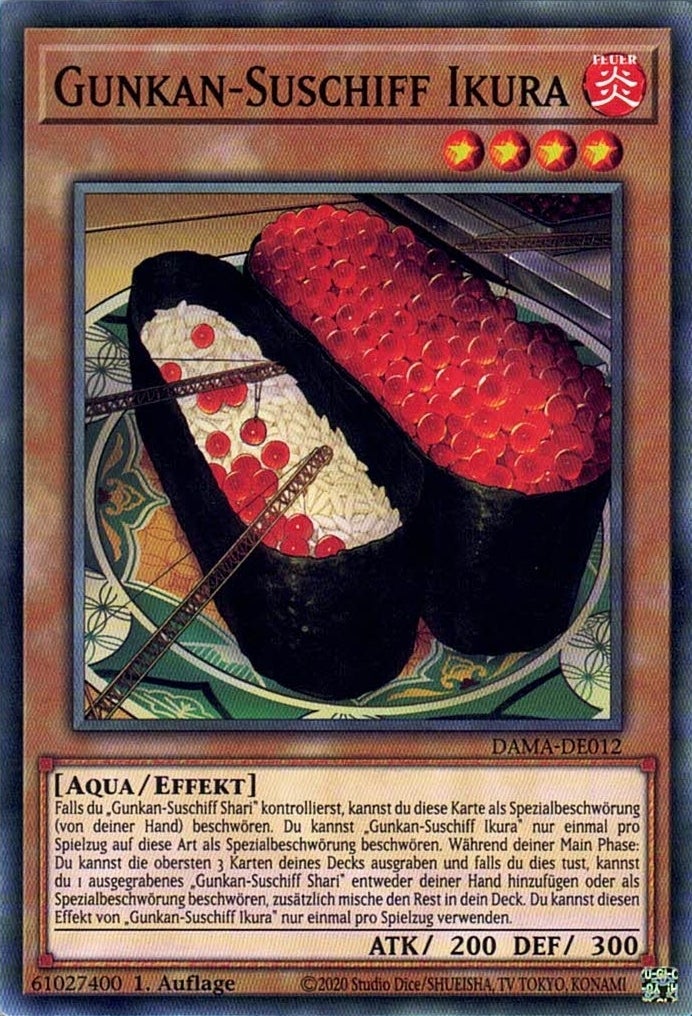 Falls du „Gunkan-Suschiff Shari“ kontrollierst, kannst du diese Karte als Spezialbeschwörung (von deiner Hand) beschwören. Du kannst „Gunkan-Suschiff Ikura“ nur einmal pro Spielzug auf diese Art als Spezialbeschwörung beschwören. Während deiner Main Phase: Du kannst die obersten 3 Karten deines Decks ausgraben und falls du dies tust, kannst du 1 ausgegrabenes „Gunkan-Suschiff Shari“ entweder deiner Hand hinzufügen oder als Spezialbeschwörung beschwören, zusätzlich mische den Rest in dein Deck. Du kannst diesen Effekt von „Gunkan-Suschiff Ikura“ nur einmal pro Spielzug verwenden.