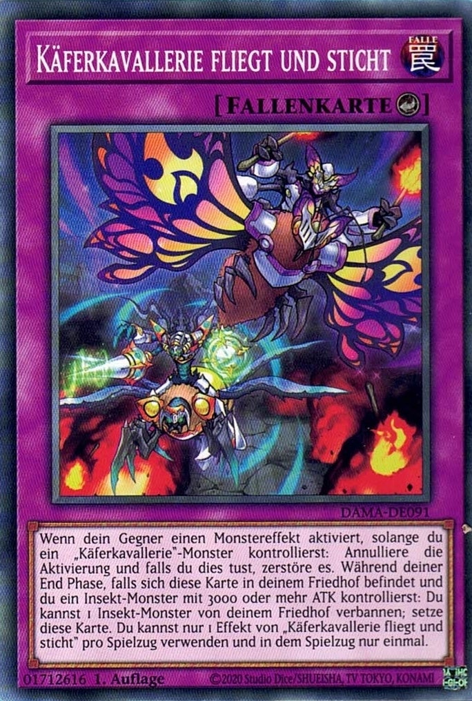 Wenn dein Gegner einen Monstereffekt aktiviert, solange du ein „Käferkavallerie“-Monster kontrollierst: Annulliere die Aktivierung und falls du dies tust, zerstöre es. Während deiner End Phase, falls sich diese Karte in deinem Friedhof befindet und du ein Insekt-Monster mit 3000 oder mehr ATK kontrollierst: Du kannst 1 Insekt-Monster von deinem Friedhof verbannen; setze diese Karte. Du kannst nur 1 Effekt von „Käferkavallerie fliegt und sticht“ pro Spielzug verwenden und in dem Spielzug nur einmal.