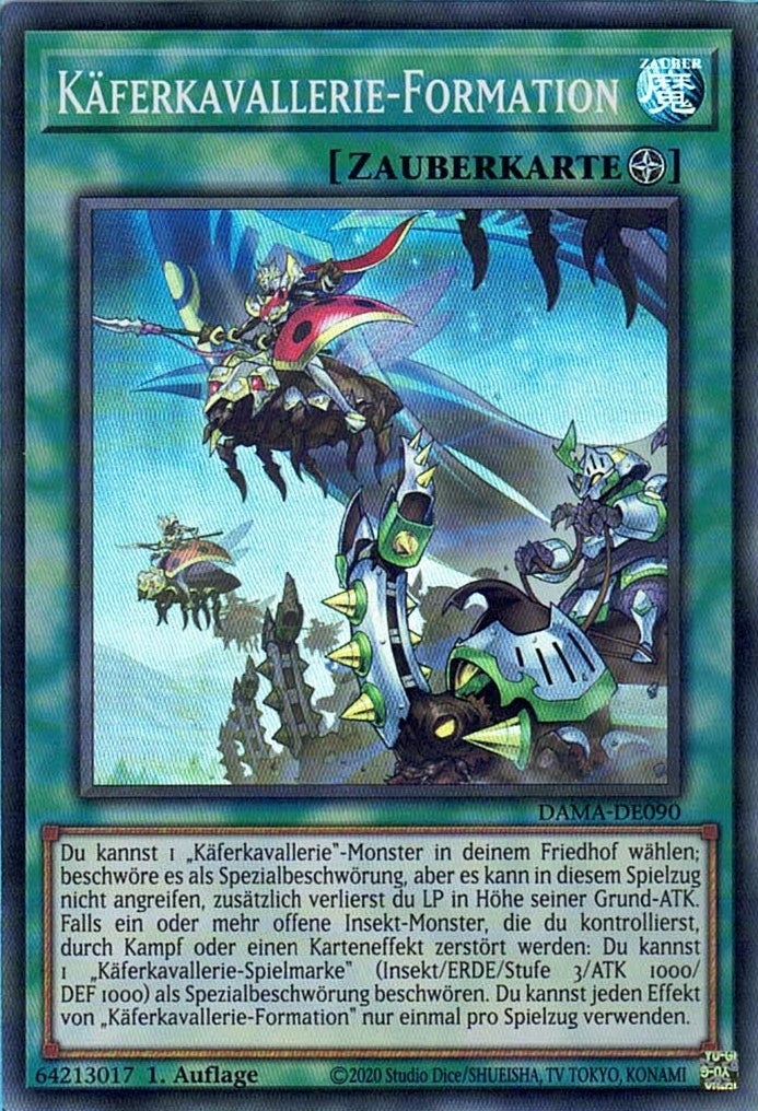 Du kannst 1 „Käferkavallerie“-Monster in deinem Friedhof wählen; beschwöre es als Spezialbeschwörung, aber es kann in diesem Spielzug nicht angreifen, zusätzlich verlierst du LP in Höhe seiner Grund-ATK. Falls ein oder mehr offene Insekt-Monster, die du kontrollierst, durch Kampf oder einen Karteneffekt zerstört werden: Du kannst 1 „Käferkavallerie-Spielmarke“ (Insekt/ERDE/Stufe 3/ATK 1000/DEF 1000) als Spezialbeschwörung beschwören. Du kannst jeden Effekt von „Käferkavallerie-Formation“ nur einmal pro Spielzug verwenden.