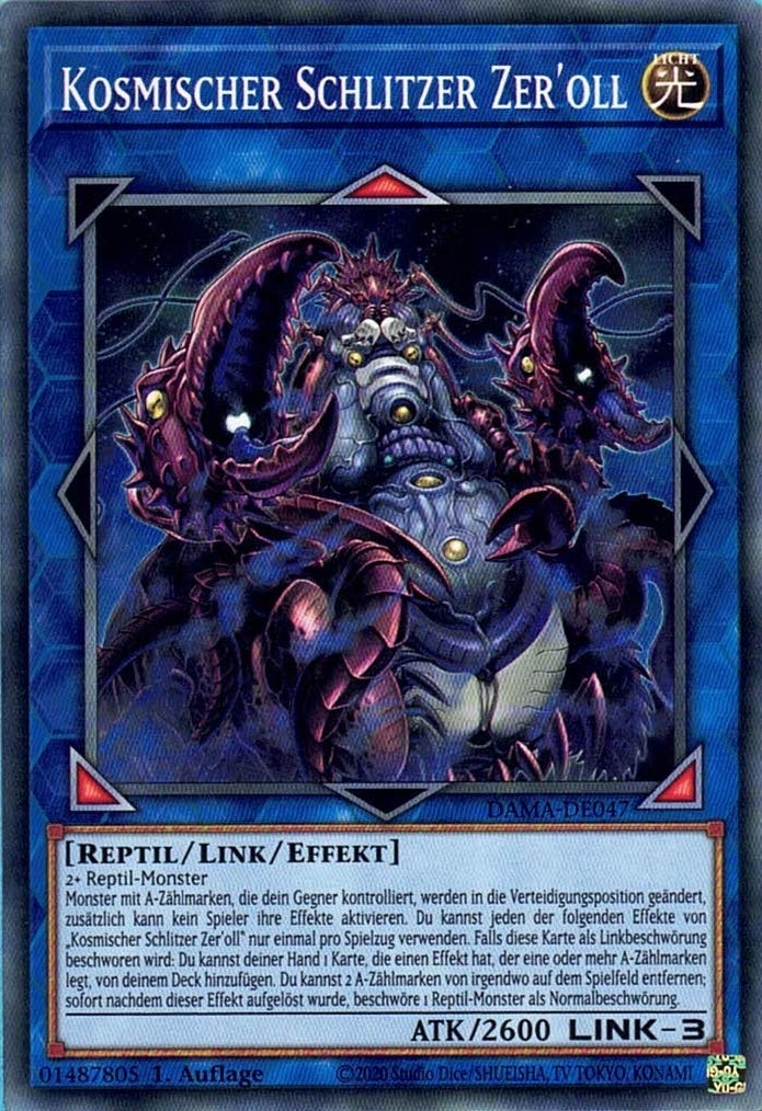 Monster mit A-Zählmarken, die dein Gegner kontrolliert, werden in die Verteidigungsposition geändert, zusätzlich kann kein Spieler ihre Effekte aktivieren. Du kannst jeden der folgenden Effekte von „Kosmischer Schlitzer Zer'oll“ nur einmal pro Spielzug verwenden. Falls diese Karte als Linkbeschwörung beschworen wird: Du kannst deiner Hand 1 Karte, die einen Effekt hat, der eine oder mehr A-Zählmarken legt, von deinem Deck hinzufügen. Du kannst 2 A-Zählmarken von irgendwo auf dem Spielfeld entfernen; sofort nachdem dieser Effekt aufgelöst wurde, beschwöre 1 Reptil-Monster als Normalbeschwörung.