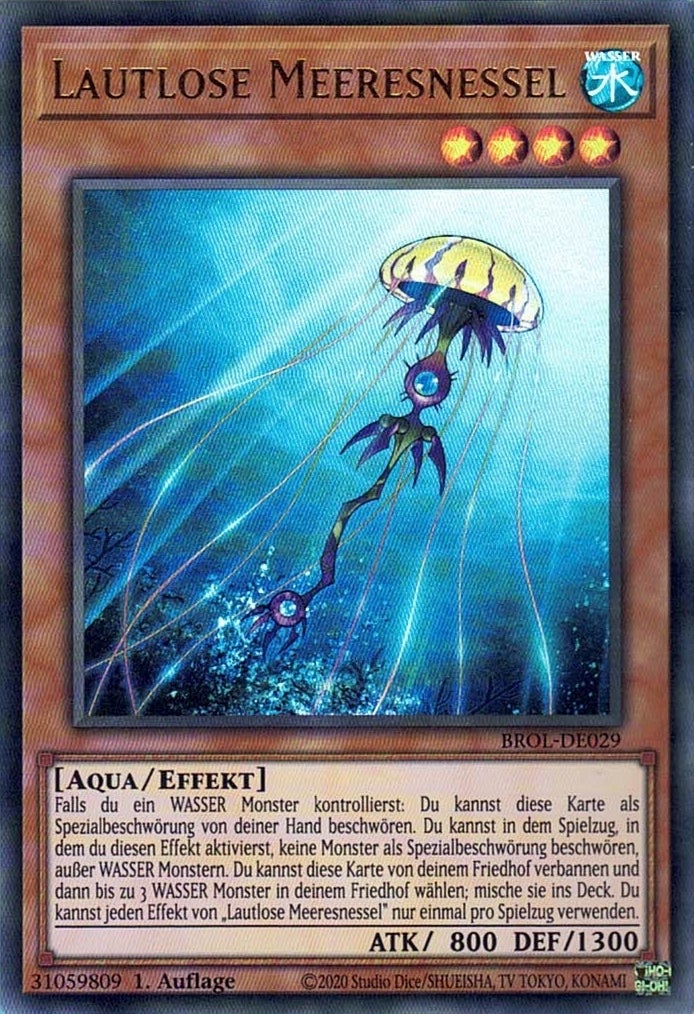 Falls du ein WASSER Monster kontrollierst: Du kannst diese Karte als Spezialbeschwörung von deiner Hand beschwören. Du kannst in dem Spielzug, in dem du diesen Effekt aktivierst, keine Monster als Spezialbeschwörung beschwören, außer WASSER Monstern. Du kannst diese Karte von deinem Friedhof verbannen und dann bis zu 3 WASSER Monster in deinem Friedhof wählen; mische sie ins Deck. Du kannst jeden Effekt von „Lautlose Meeresnessel“ nur einmal pro Spielzug verwenden.