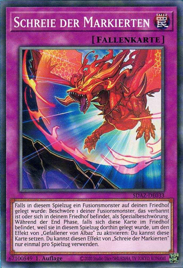 Falls in diesem Spielzug ein Fusionsmonster auf deinen Friedhof gelegt wird: Beschwöre 1 deiner Fusionsmonster, das verbannt ist oder sich in deinem Friedhof befindet, als Spezialbeschwörung. Während der End Phase, falls sich diese Karte im Friedhof befindet, weil sie in diesem Spielzug dorthin gelegt wurde, um den Effekt von „Gefallener von Albaz“ zu aktivieren: Du kannst diese Karte setzen. Du kannst diesen Effekt von „Schreie der Markierten“ nur einmal pro Spielzug verwenden.