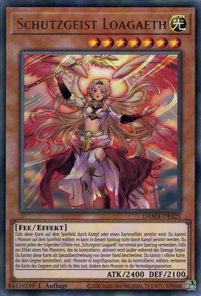 Falls diese Karte auf dem Spielfeld durch Kampf oder einen Karteneffekt zerstört wird: Du kannst 1 Monster auf dem Spielfeld wählen; es kann in diesem Spielzug nicht durch Kampf zerstört werden. Du kannst jeden der folgenden Effekte von „Schutzgeist Loagaeth“ nur einmal pro Spielzug verwenden. Falls ein Effekt eines Fee-Monsters, das du kontrollierst, aktiviert wird (außer während des Damage Steps): Du kannst diese Karte als Spezialbeschwörung von deiner Hand beschwören. Du kannst 1 offene Karte, die dein Gegner kontrolliert, und 1 Monster in Angriffsposition, das du kontrollierst, wählen; verbanne die Karte des Gegners und falls du dies tust, ändere dein Monster in die Verteidigungsposition.