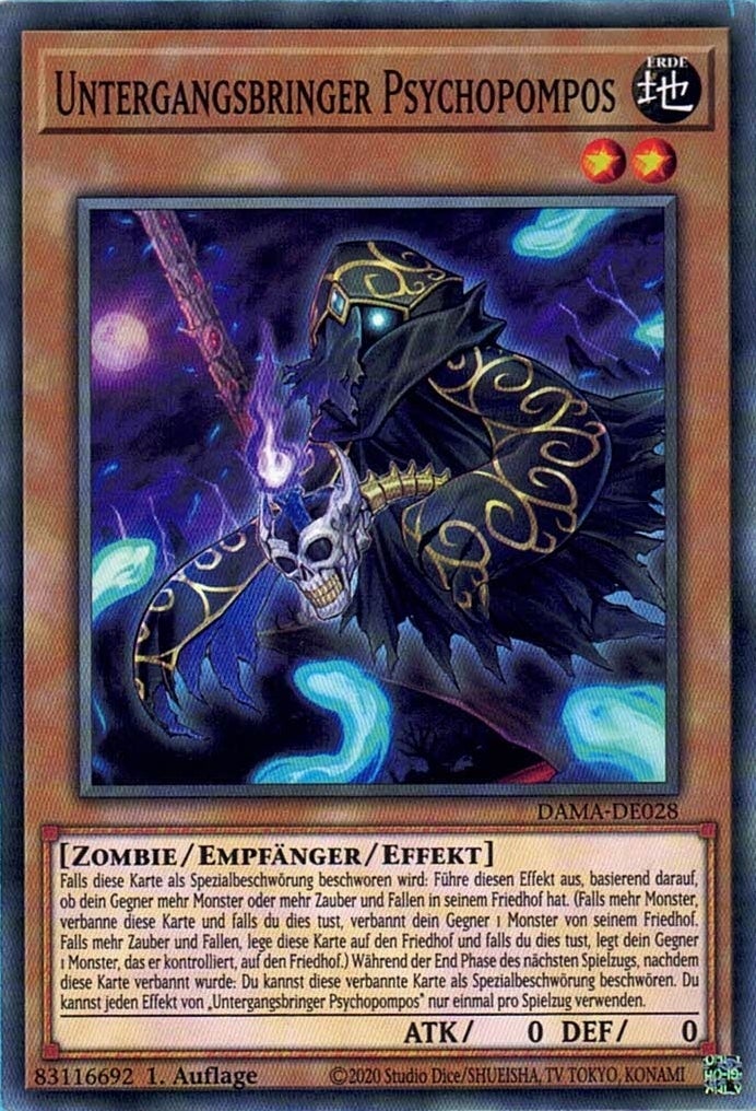 Falls diese Karte als Spezialbeschwörung beschworen wird: Führe diesen Effekt aus, basierend darauf, ob dein Gegner mehr Monster oder mehr Zauber und Fallen in seinem Friedhof hat. (Falls mehr Monster, verbanne diese Karte und falls du dies tust, verbannt dein Gegner 1 Monster von seinem Friedhof. Falls mehr Zauber und Fallen, lege diese Karte auf den Friedhof und falls du dies tust, legt dein Gegner 1 Monster, das er kontrolliert, auf den Friedhof.) Während der End Phase des nächsten Spielzugs, nachdem diese Karte verbannt wurde: Du kannst diese verbannte Karte als Spezialbeschwörung beschwören. Du kannst jeden Effekt von „Untergangsbringer Psychopompos“ nur einmal pro Spielzug verwenden.