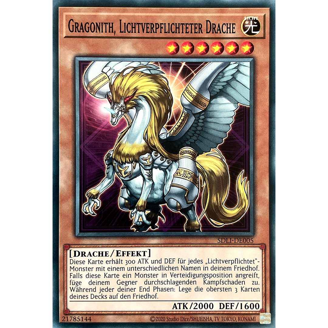 Kann nicht als Normalbeschwörung beschworen/gesetzt werden. Muss als Spezialbeschwörung (von deiner Hand) beschworen werden, indem du 4 oder mehr „Lichtverpflichtet“-Monster mit unterschiedlichen Namen in deinem Friedhof hast. Du kannst 1000 LP zahlen; zerstöre alle anderen Karten auf dem Spielfeld. Einmal pro Spielzug, während deiner End Phase: Lege die obersten 4 Karten deines Decks auf den Friedhof.