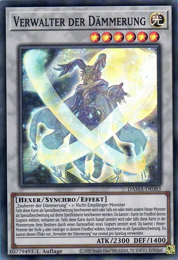 „Zauberer der Dämmerung“ + 1+ Nicht-Empfänger-MonsterFalls diese Karte als Spezialbeschwörung beschworen wird oder falls ein oder mehr andere Hexer-Monster als Spezialbeschwörung auf deine Spielfeldseite beschworen werden: Du kannst 1 Karte im Friedhof deines Gegners wählen; verbanne sie. Falls diese Karte durch Kampf zerstört wird oder falls diese Karte in der Monsterzone ihres Besitzers durch einen Karteneffekt eines Gegners zerstört wird: Du kannst 1 Hexer-Monster der Stufe 4 oder niedriger in deinem Friedhof wählen; beschwöre es als Spezialbeschwörung. Du kannst diesen Effekt von „Verwalter der Dämmerung“ nur einmal pro Spielzug verwenden.