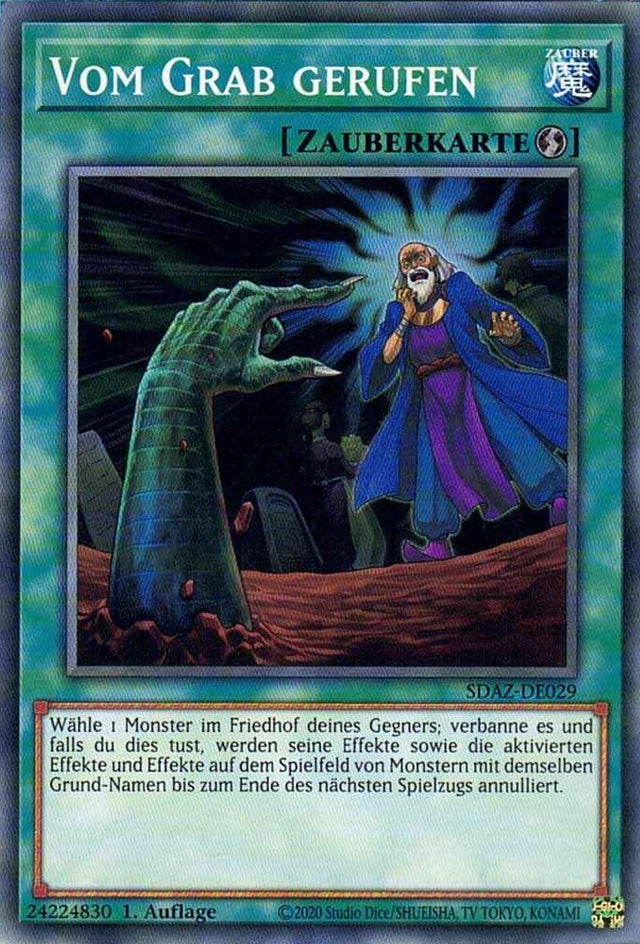 Wähle 1 Monster im Friedhof deines Gegners; verbanne es und falls du dies tust, werden seine Effekte sowie die aktivierten Effekte und Effekte auf dem Spielfeld von Monstern mit demselben Grund-Namen bis zum Ende des nächsten Spielzugs annulliert.